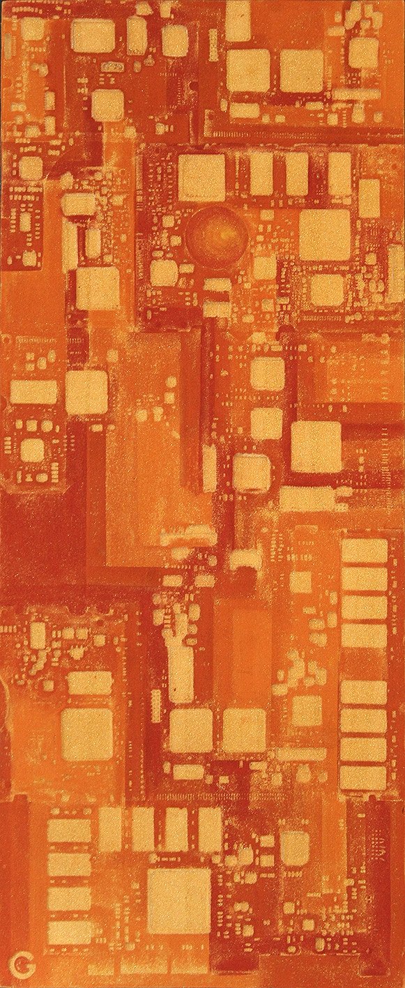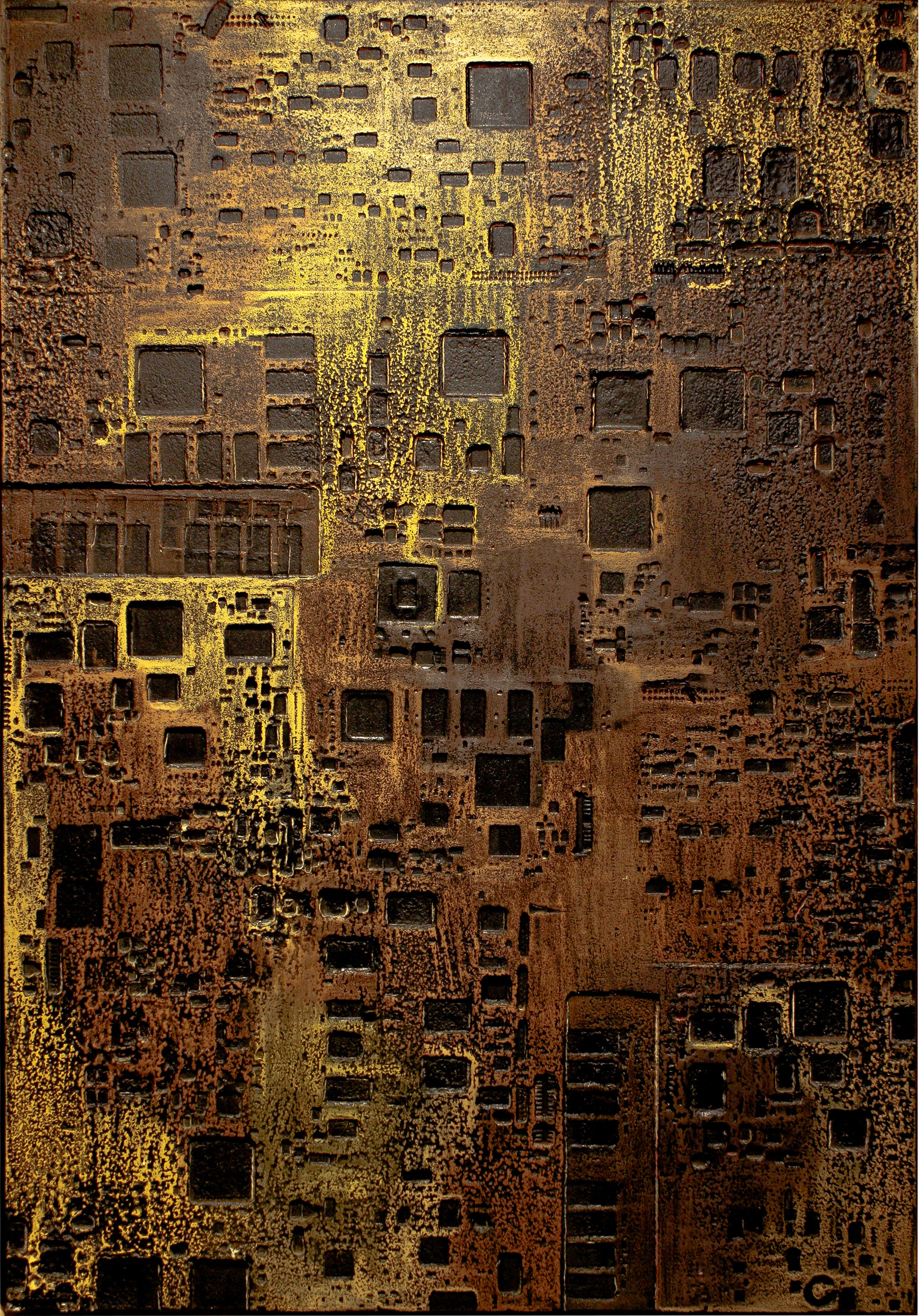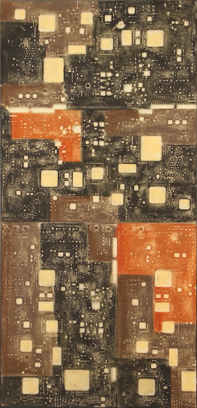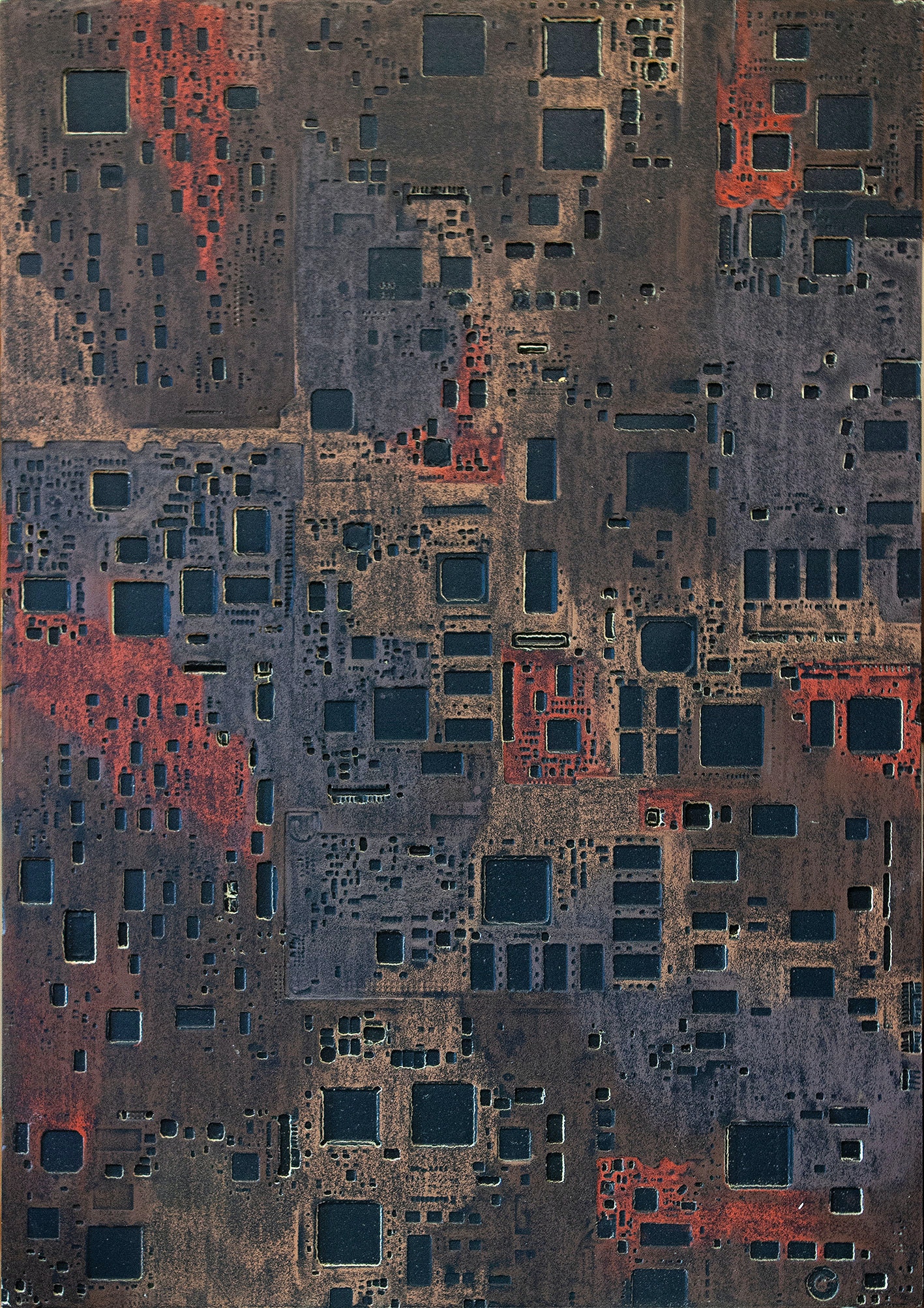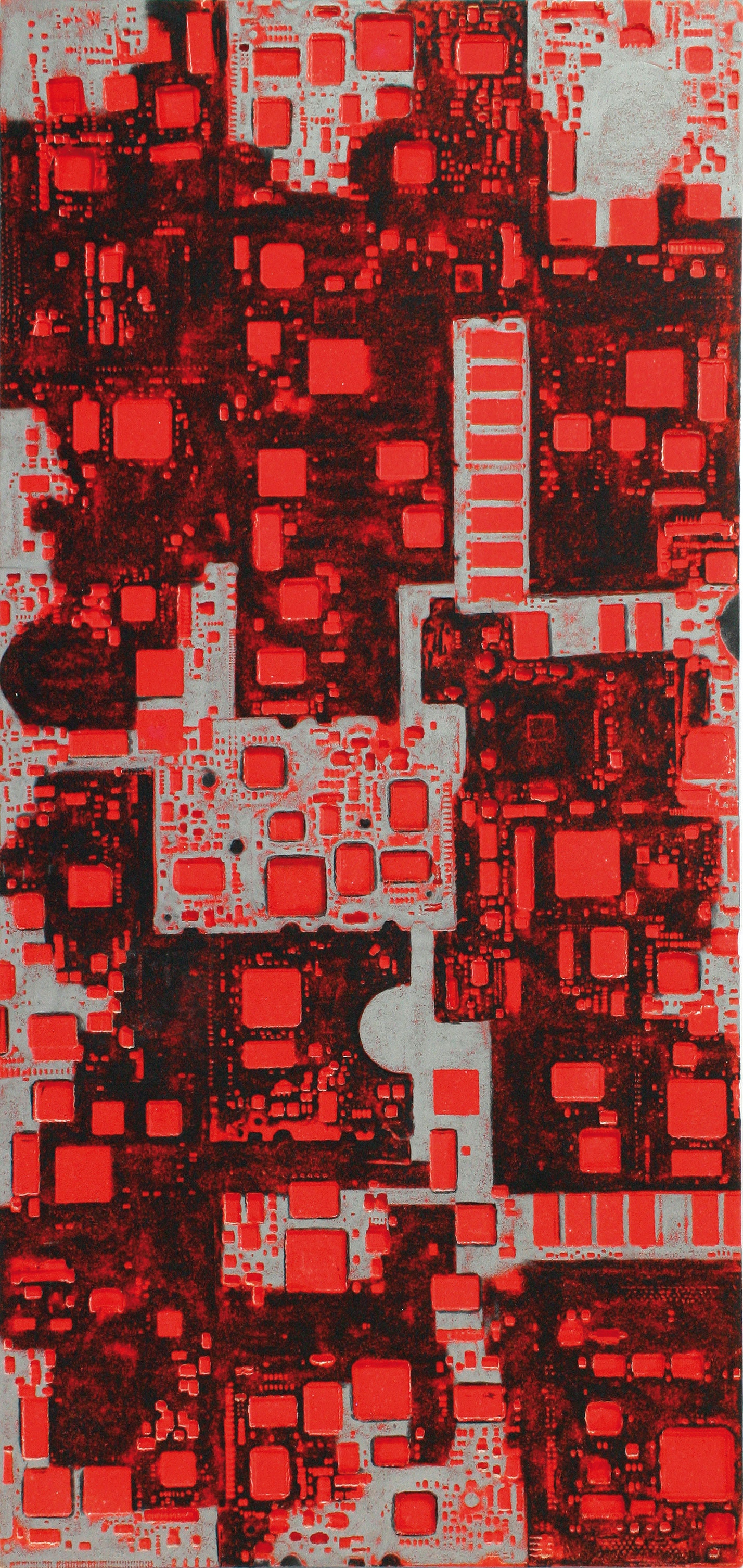 La curiosità per la tecnologia, l’elettronica e la grafica convogliano le forme e i segni, che albergano nella sua mente, verso la sperimentazione plastica con diversi materiali.