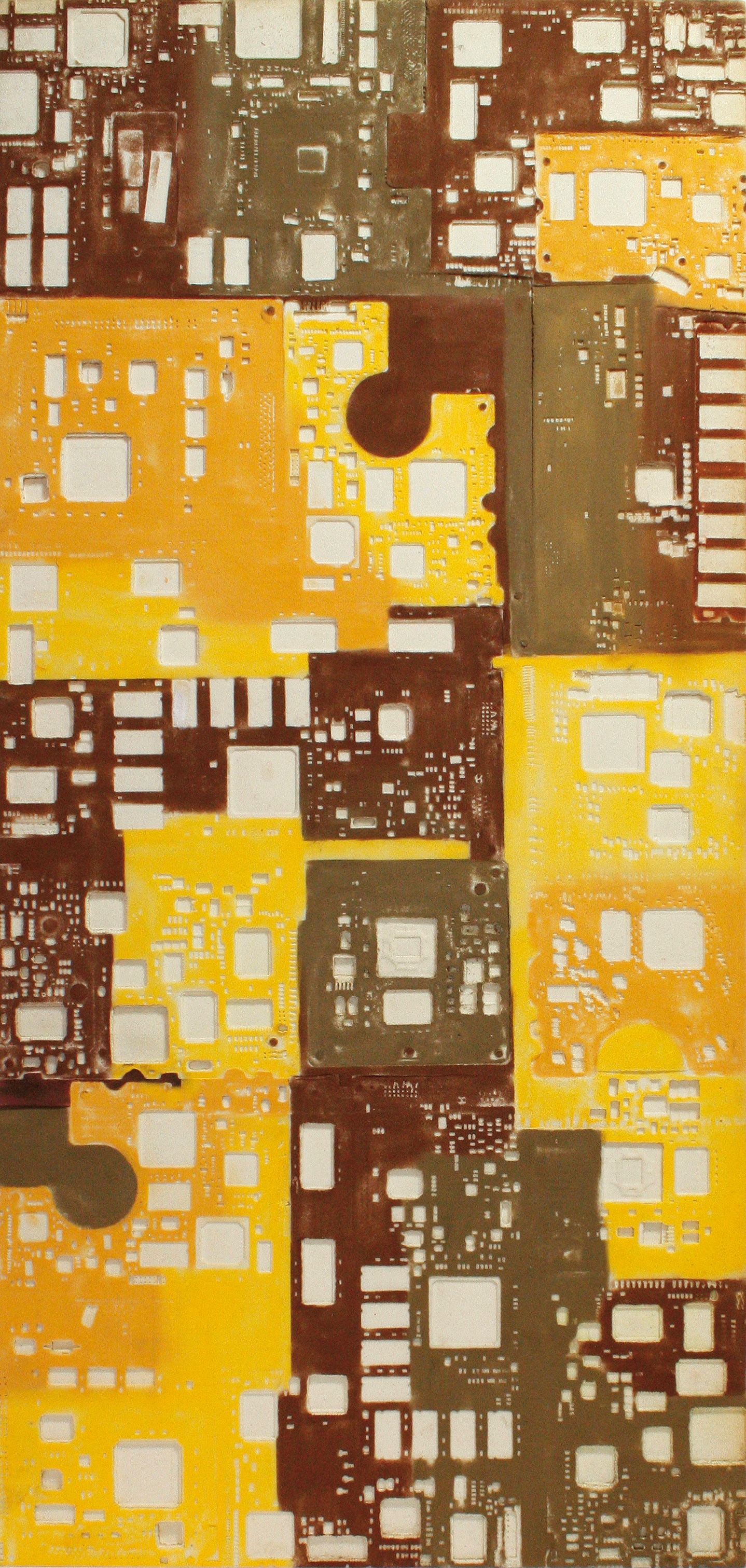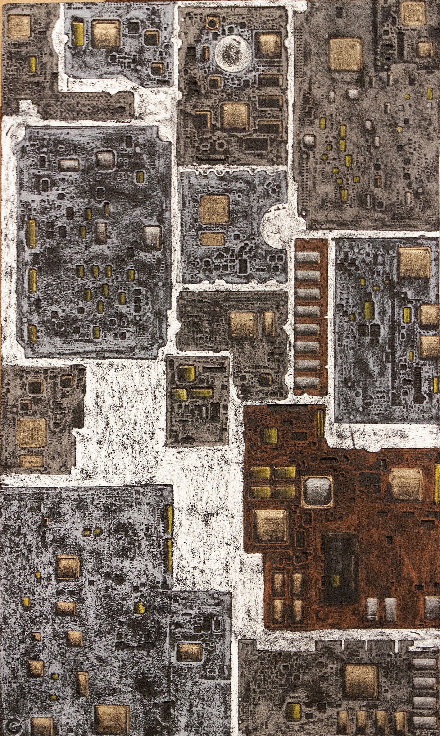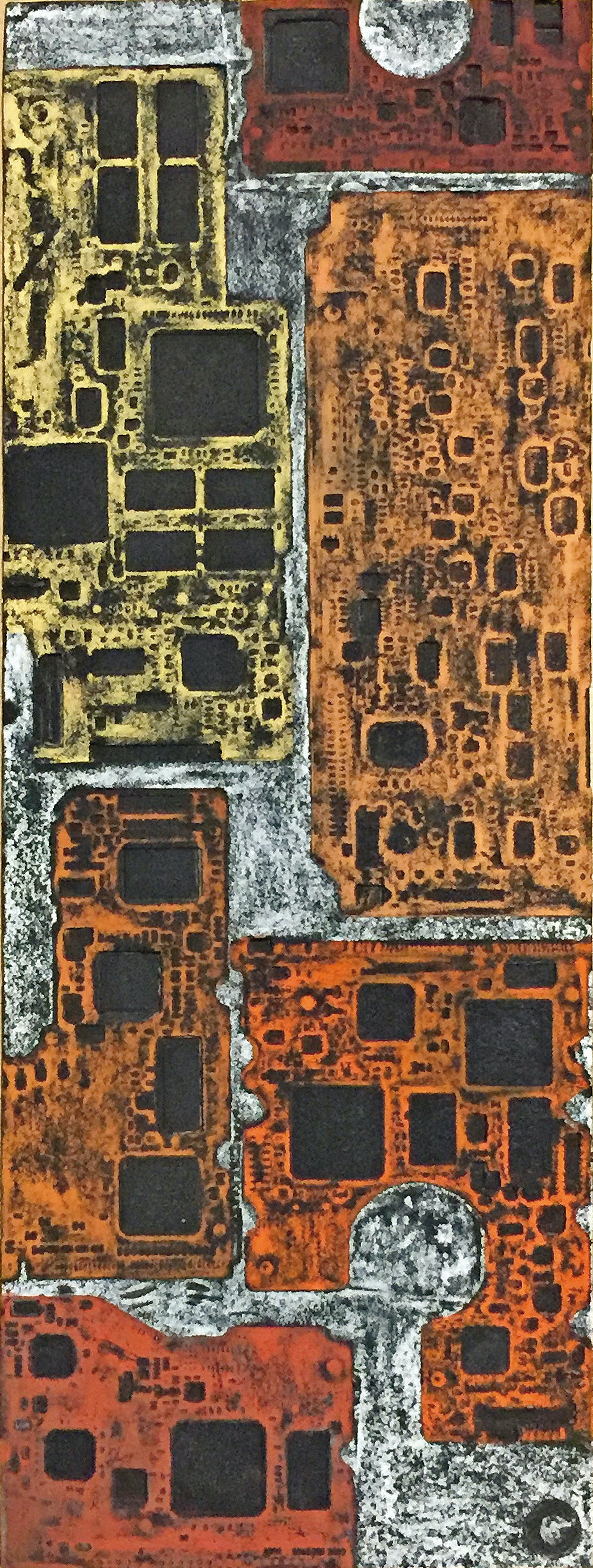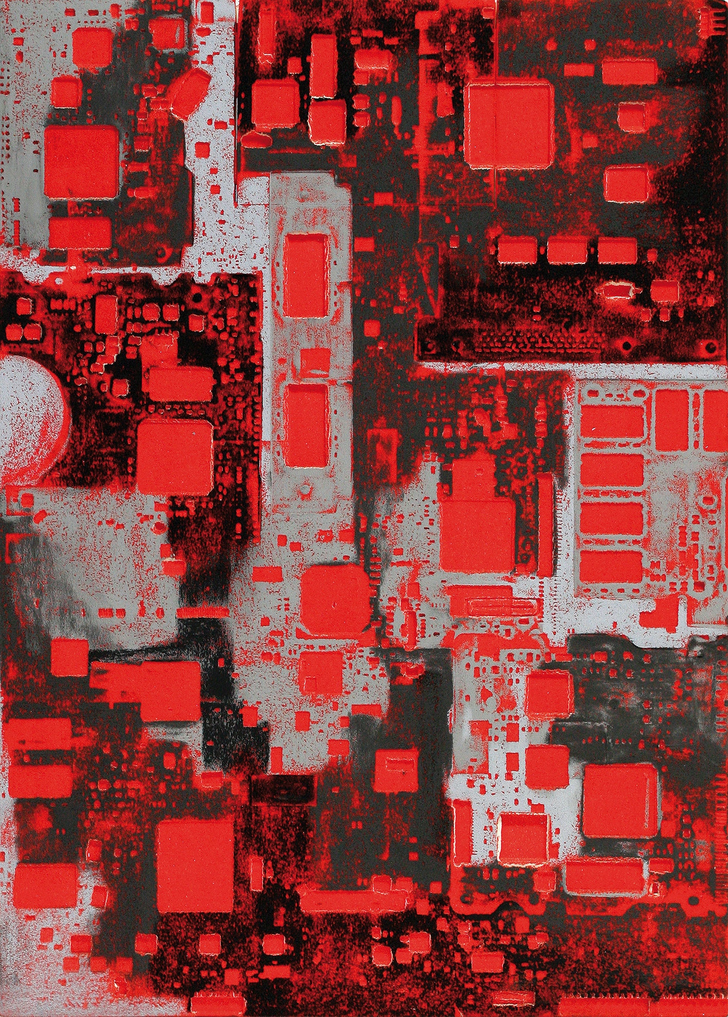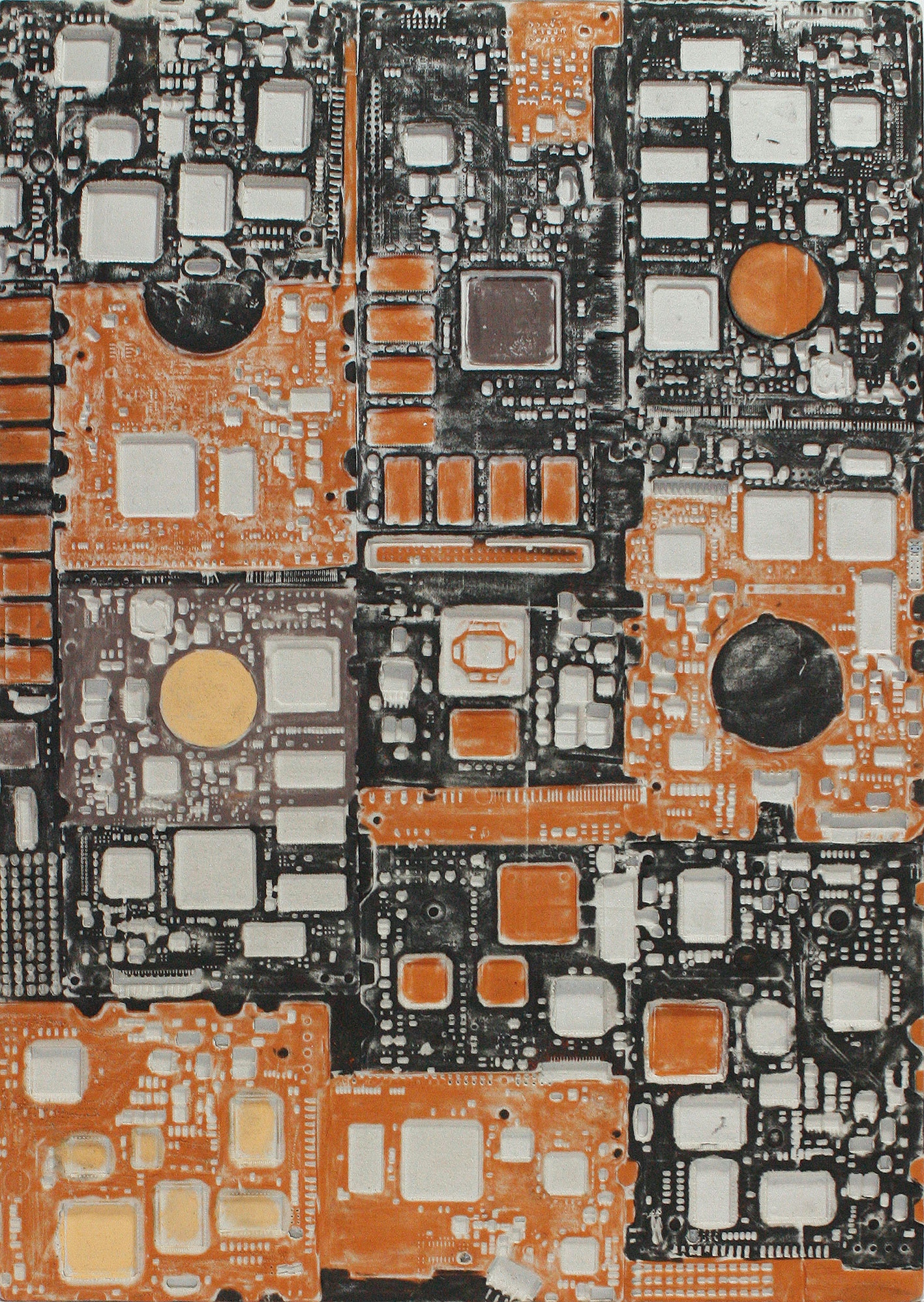 La curiosità per la tecnologia, l’elettronica e la grafica convogliano le forme e i segni, che albergano nella sua mente, verso la sperimentazione plastica con diversi materiali.
