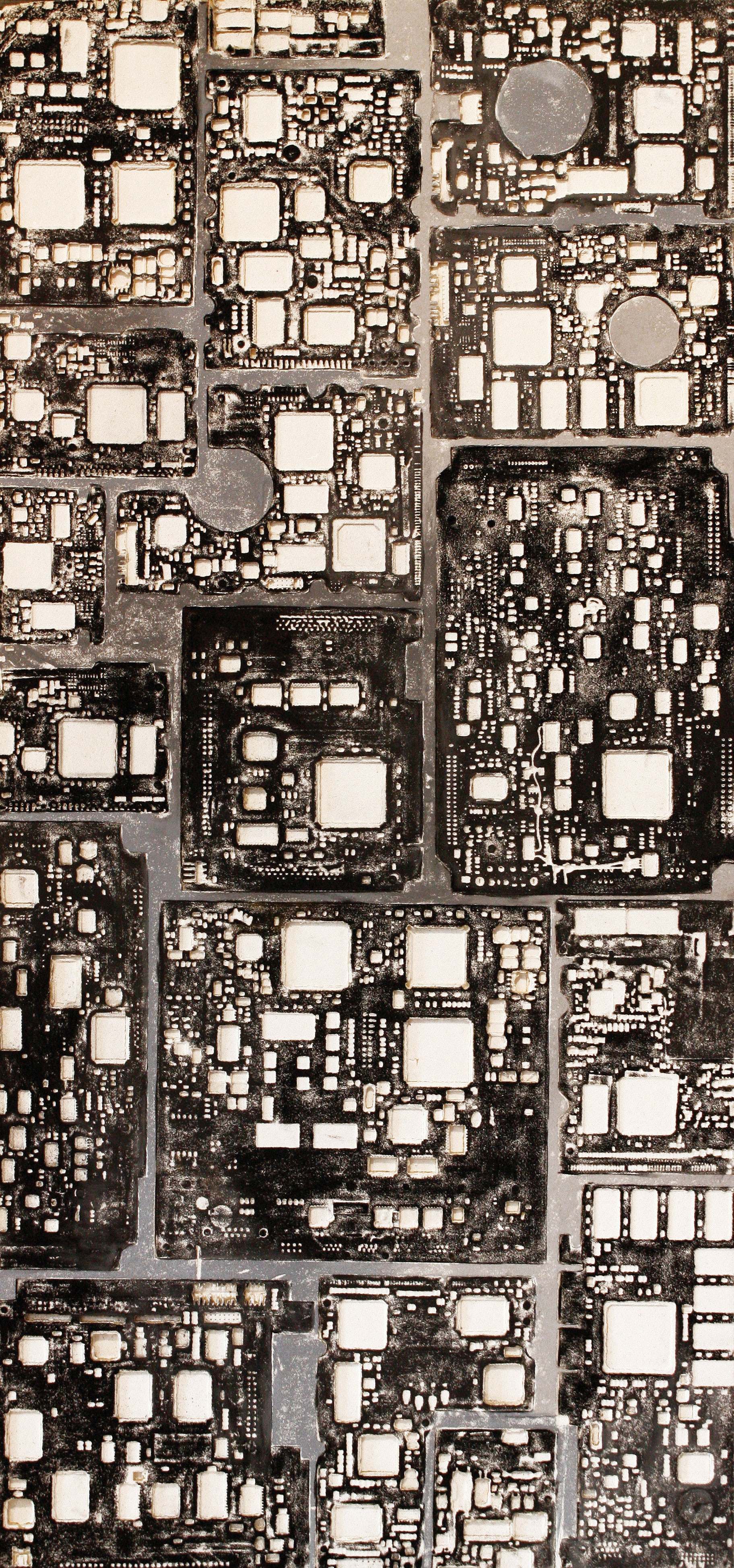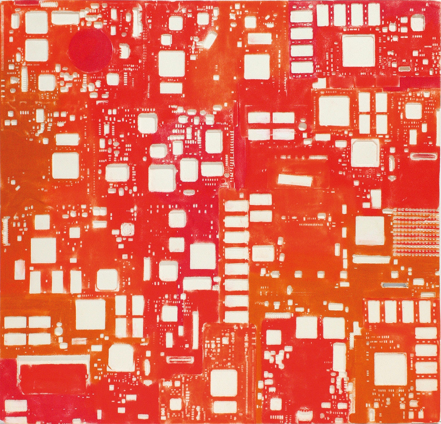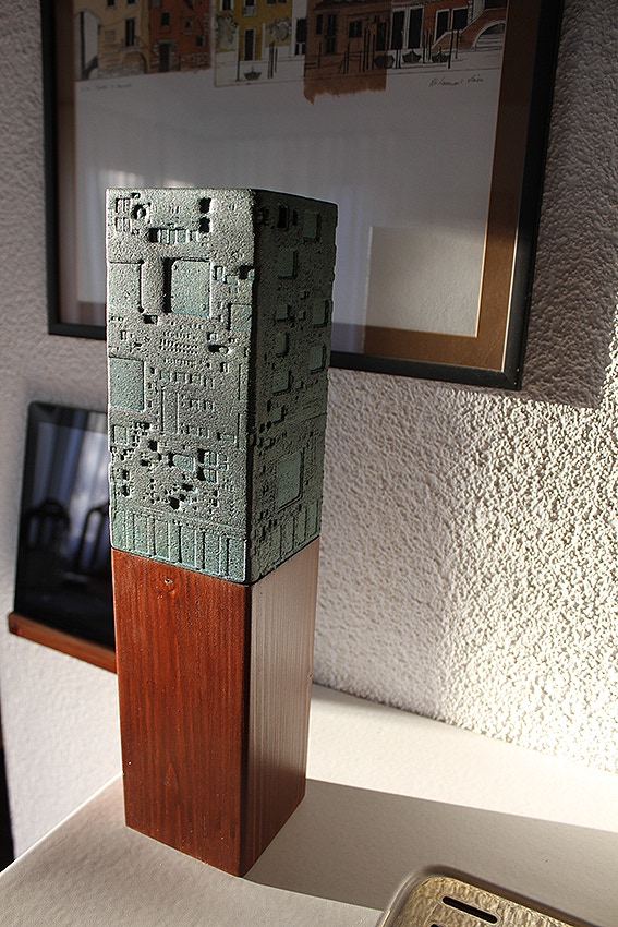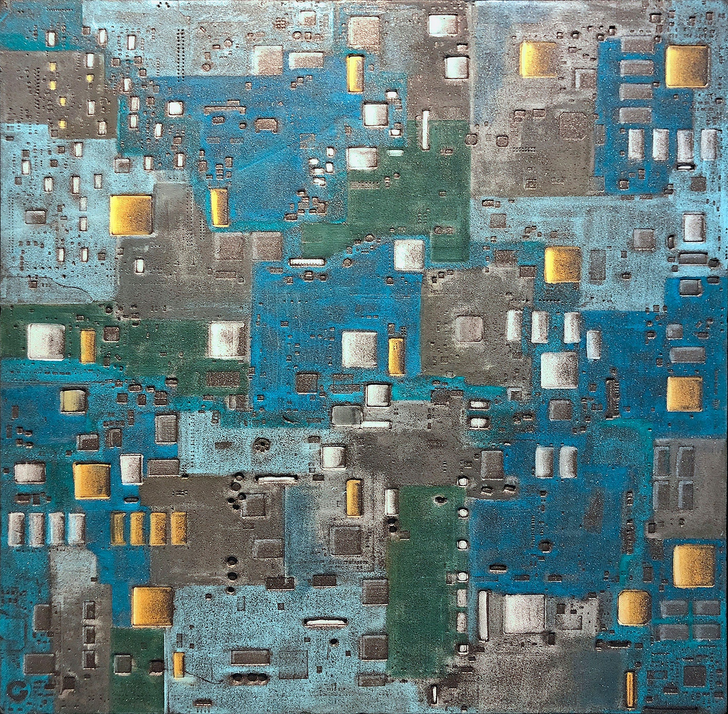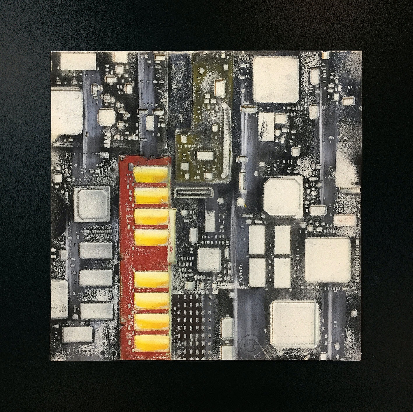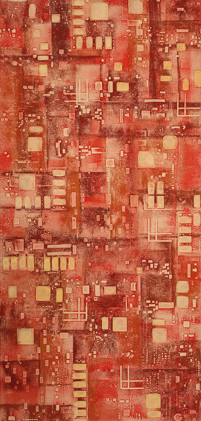 La curiosità per la tecnologia, l’elettronica e la grafica convogliano le forme e i segni, che albergano nella sua mente, verso la sperimentazione plastica con diversi materiali.