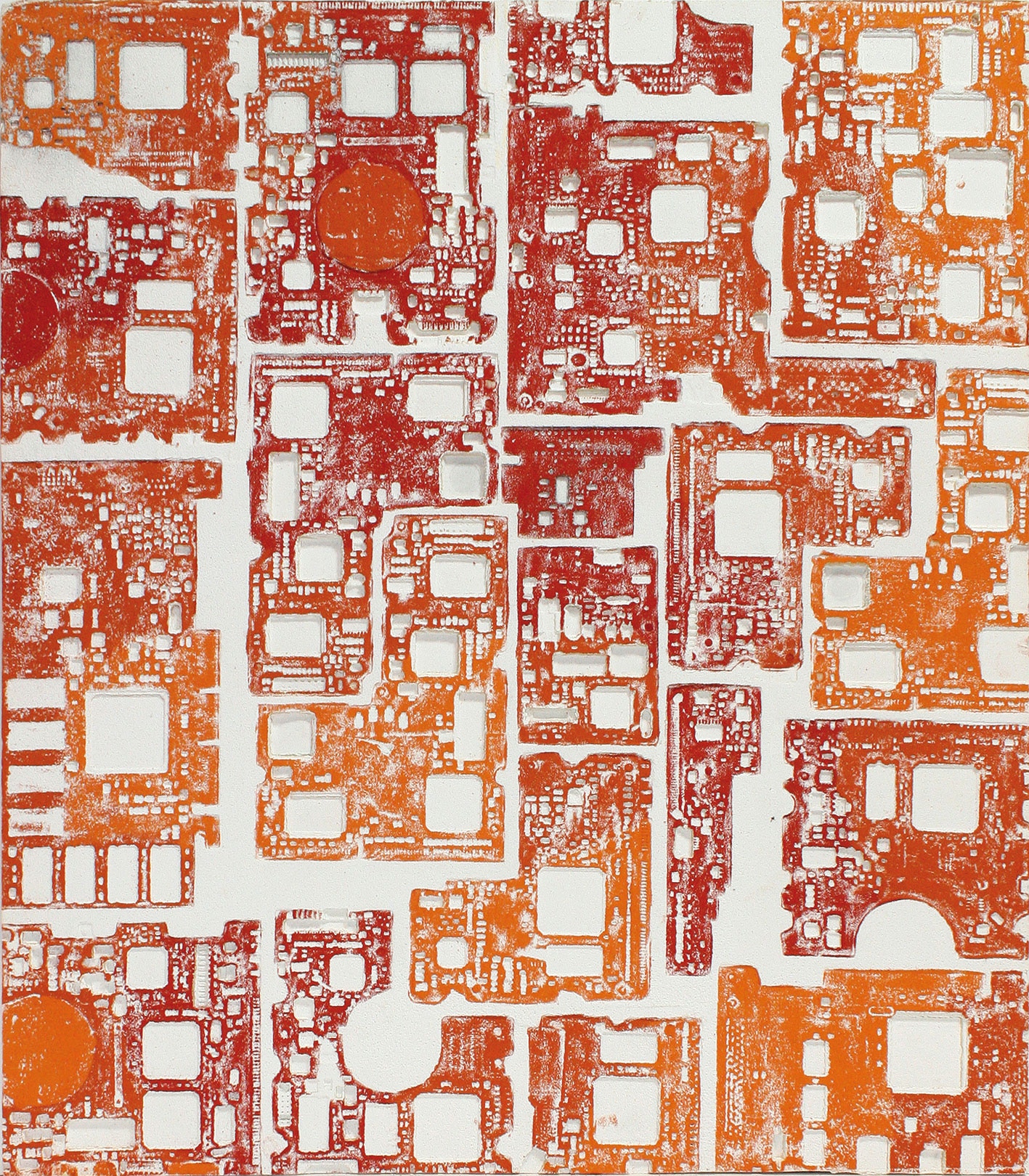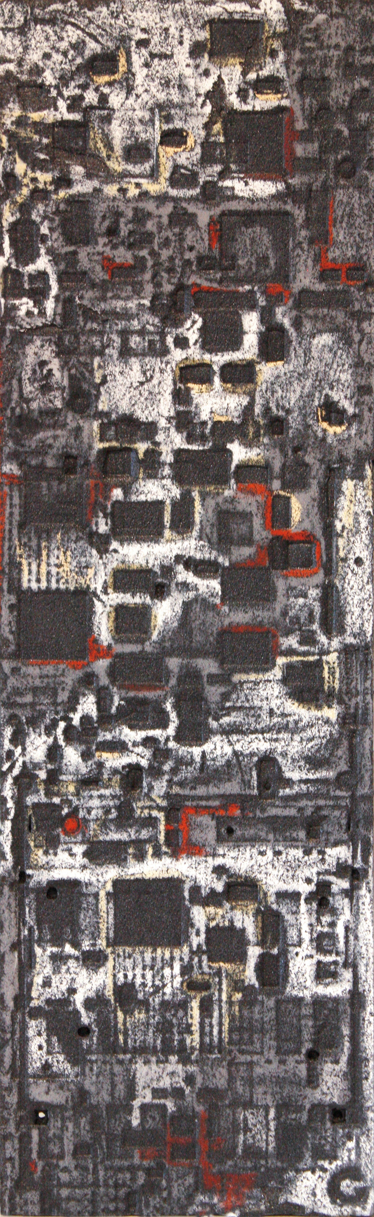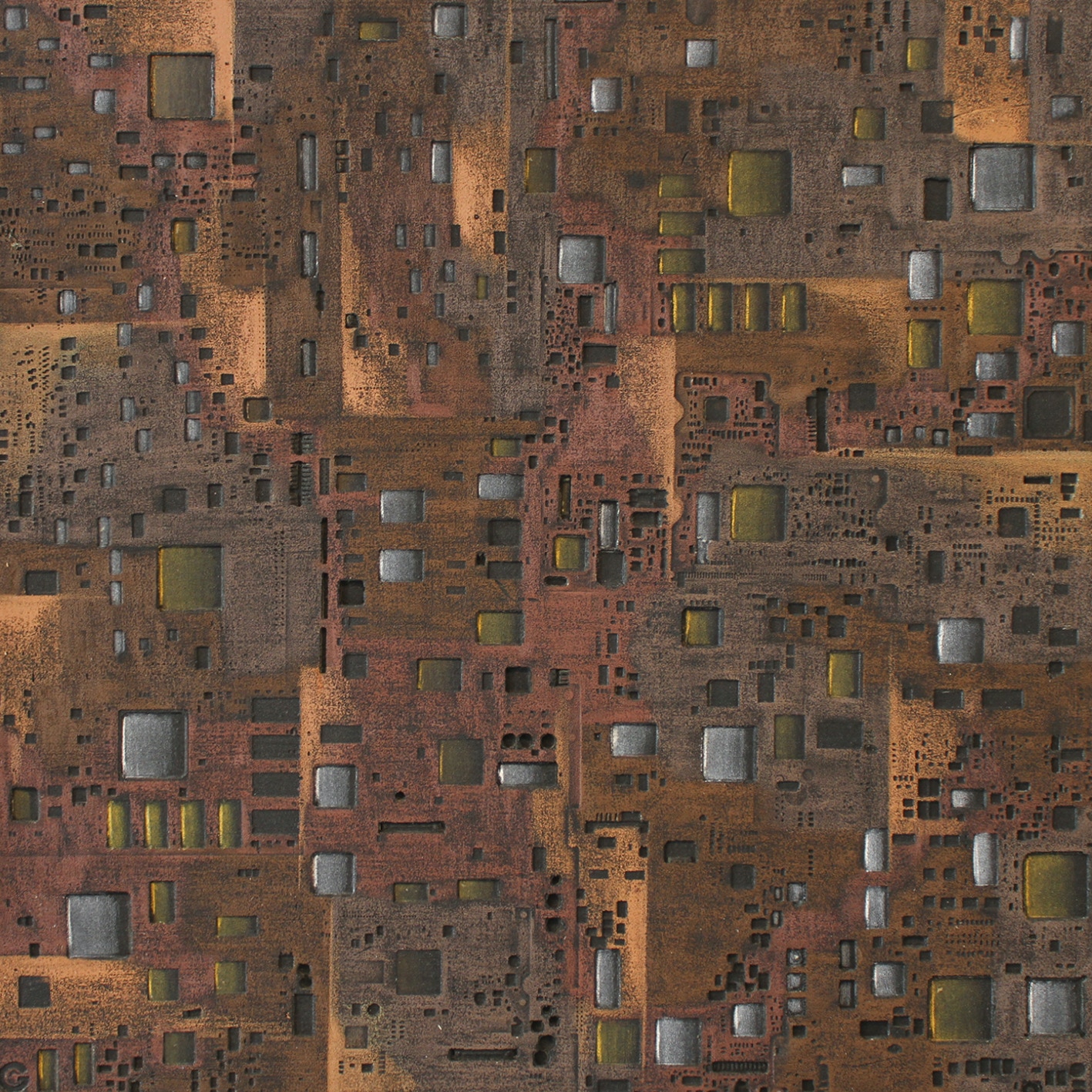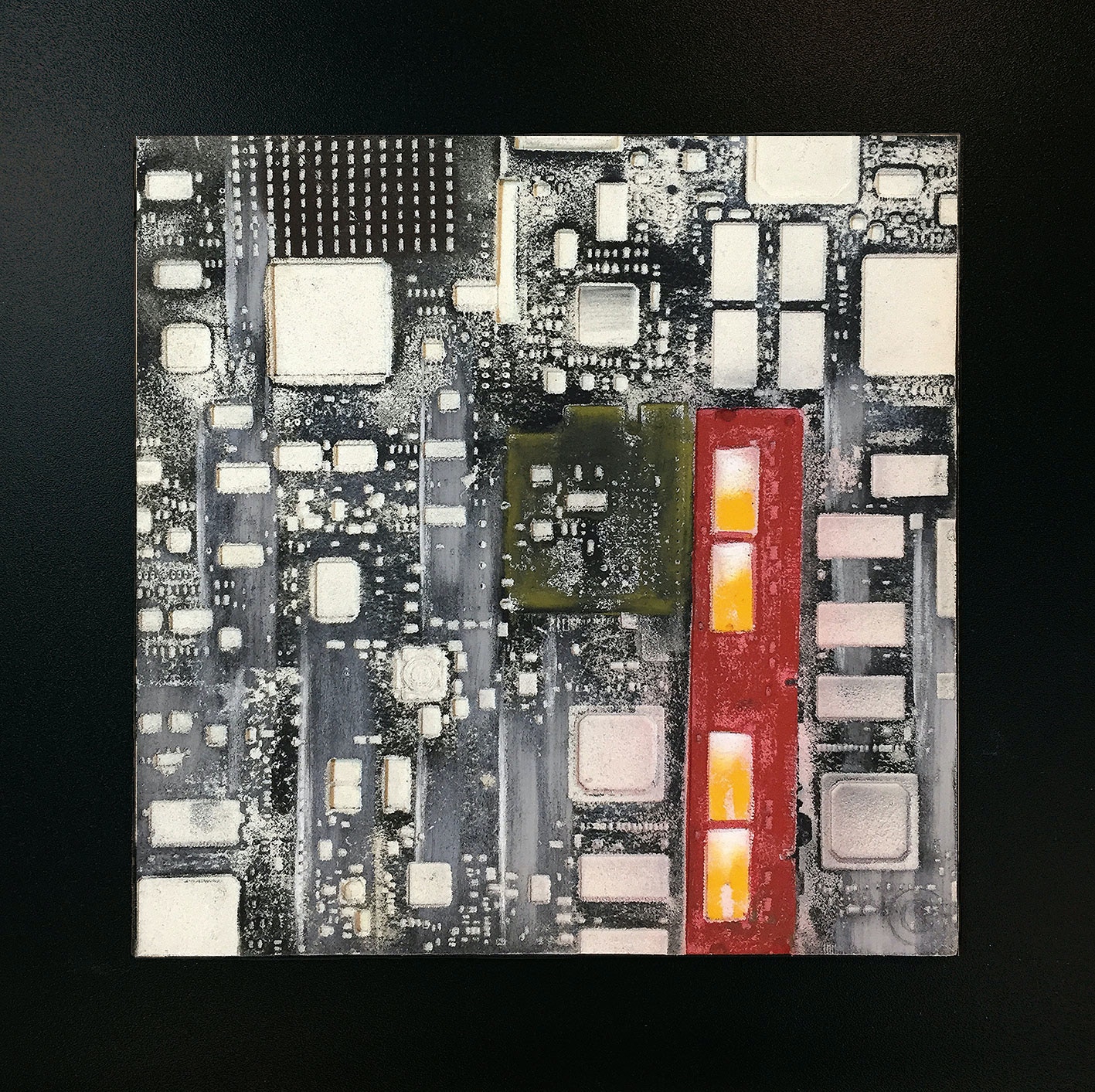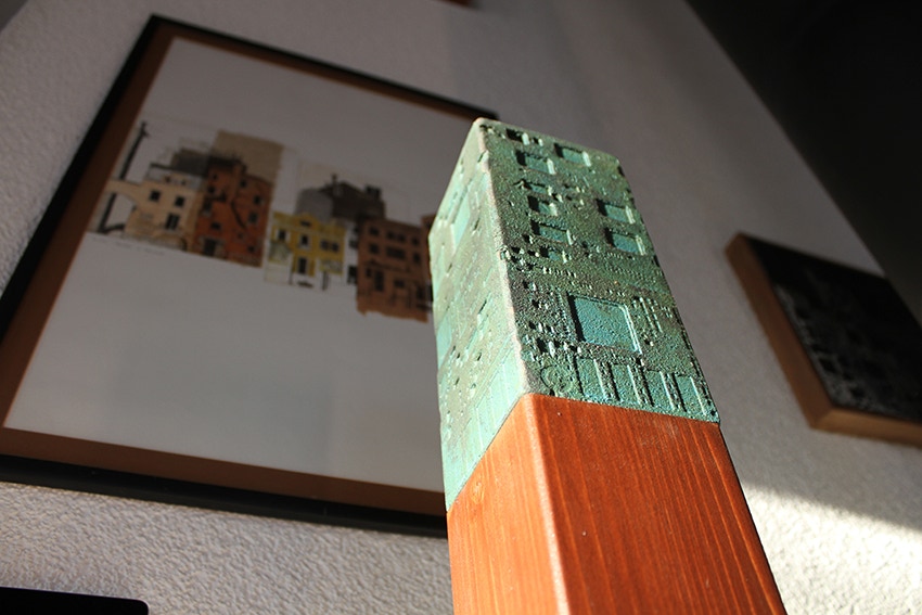La curiosità per la tecnologia, l’elettronica e la grafica convogliano le forme e i segni, che albergano nella sua mente, verso la sperimentazione plastica con diversi materiali.