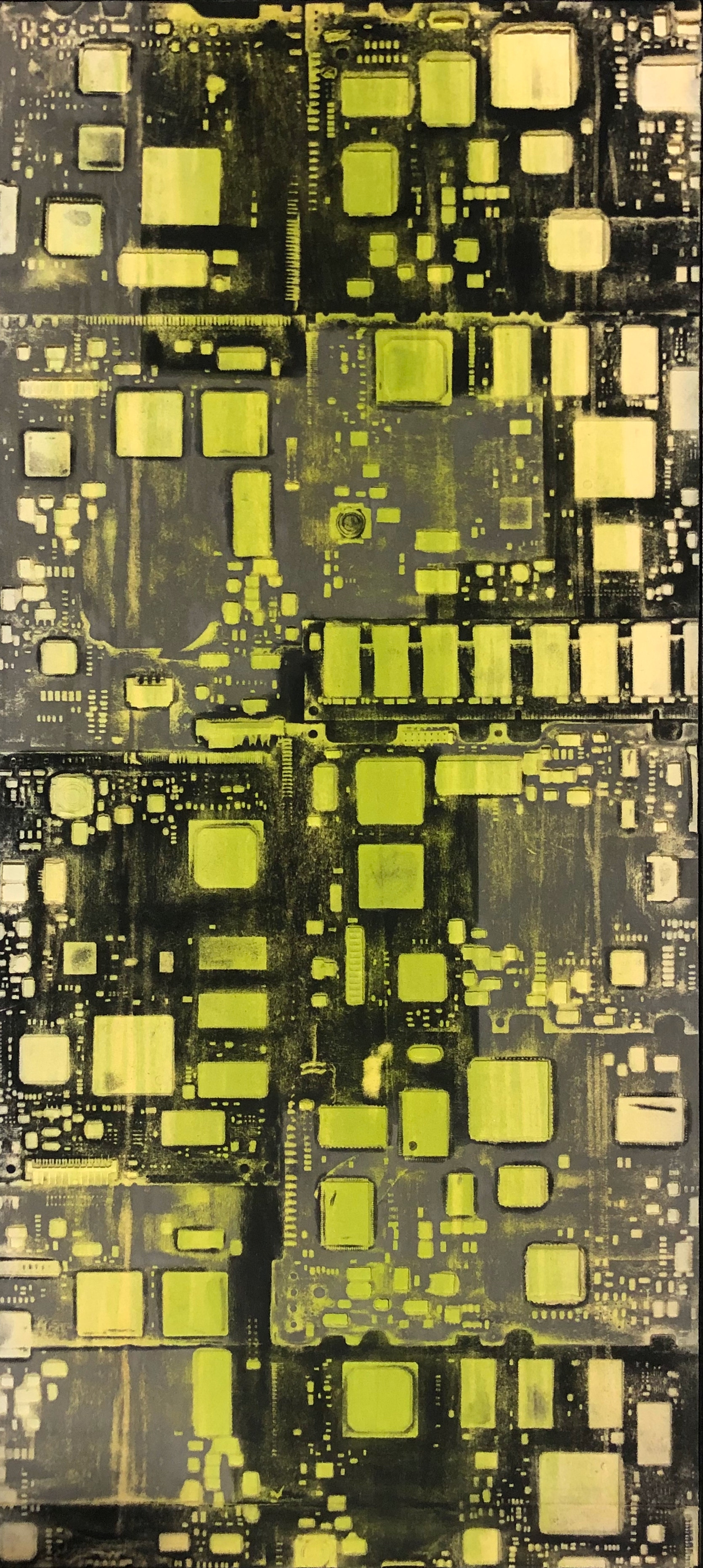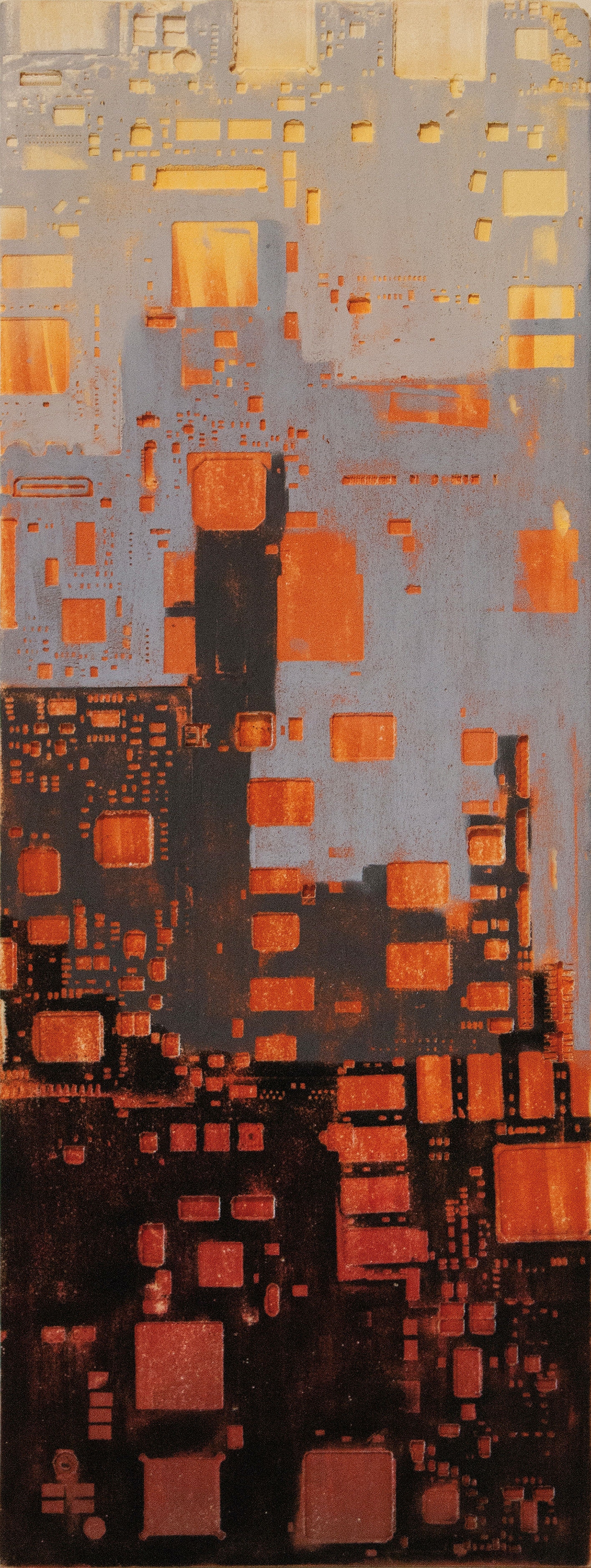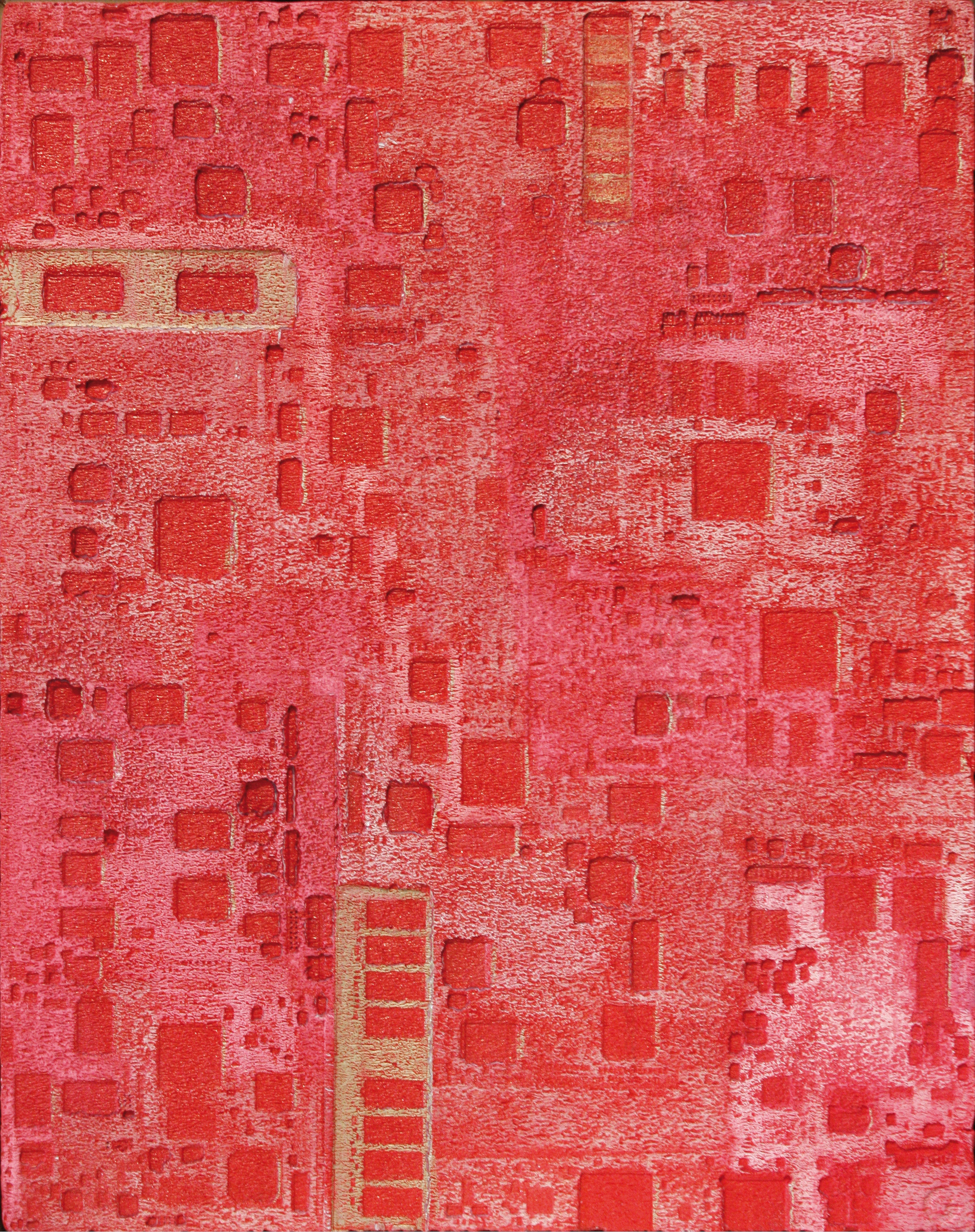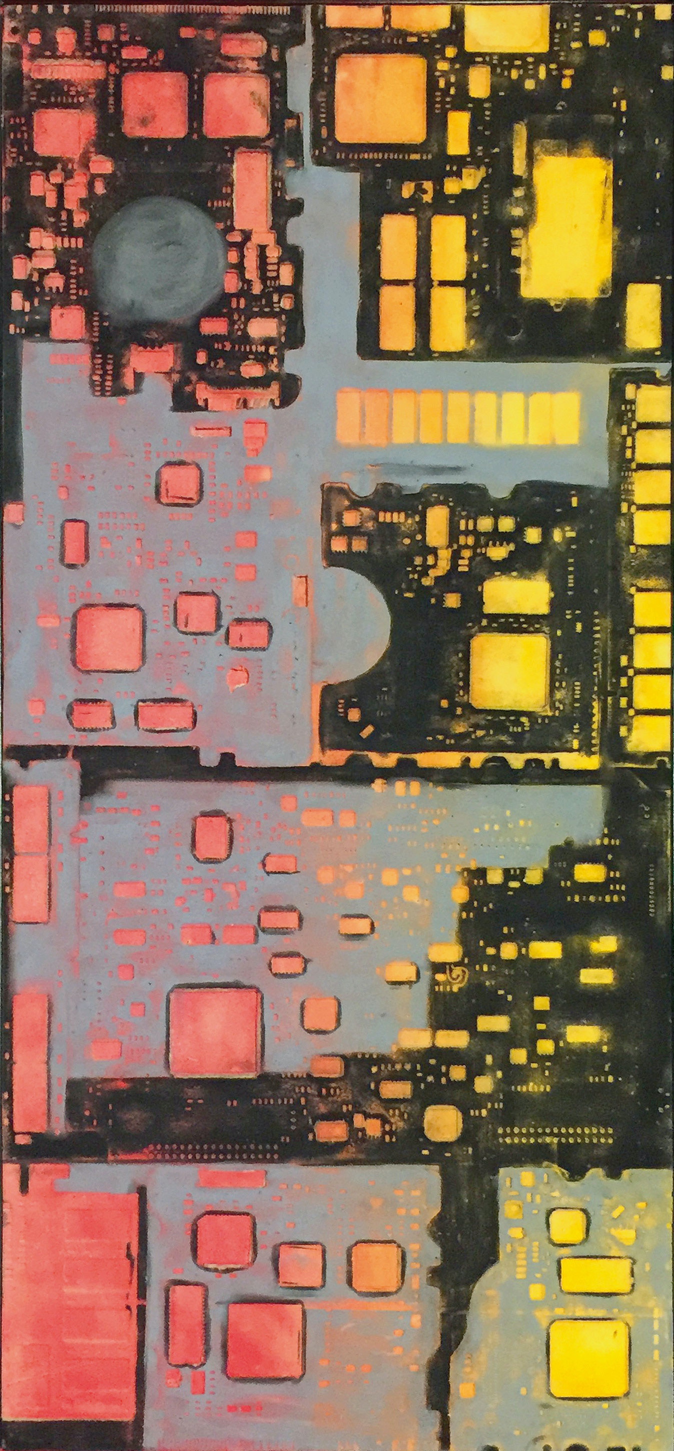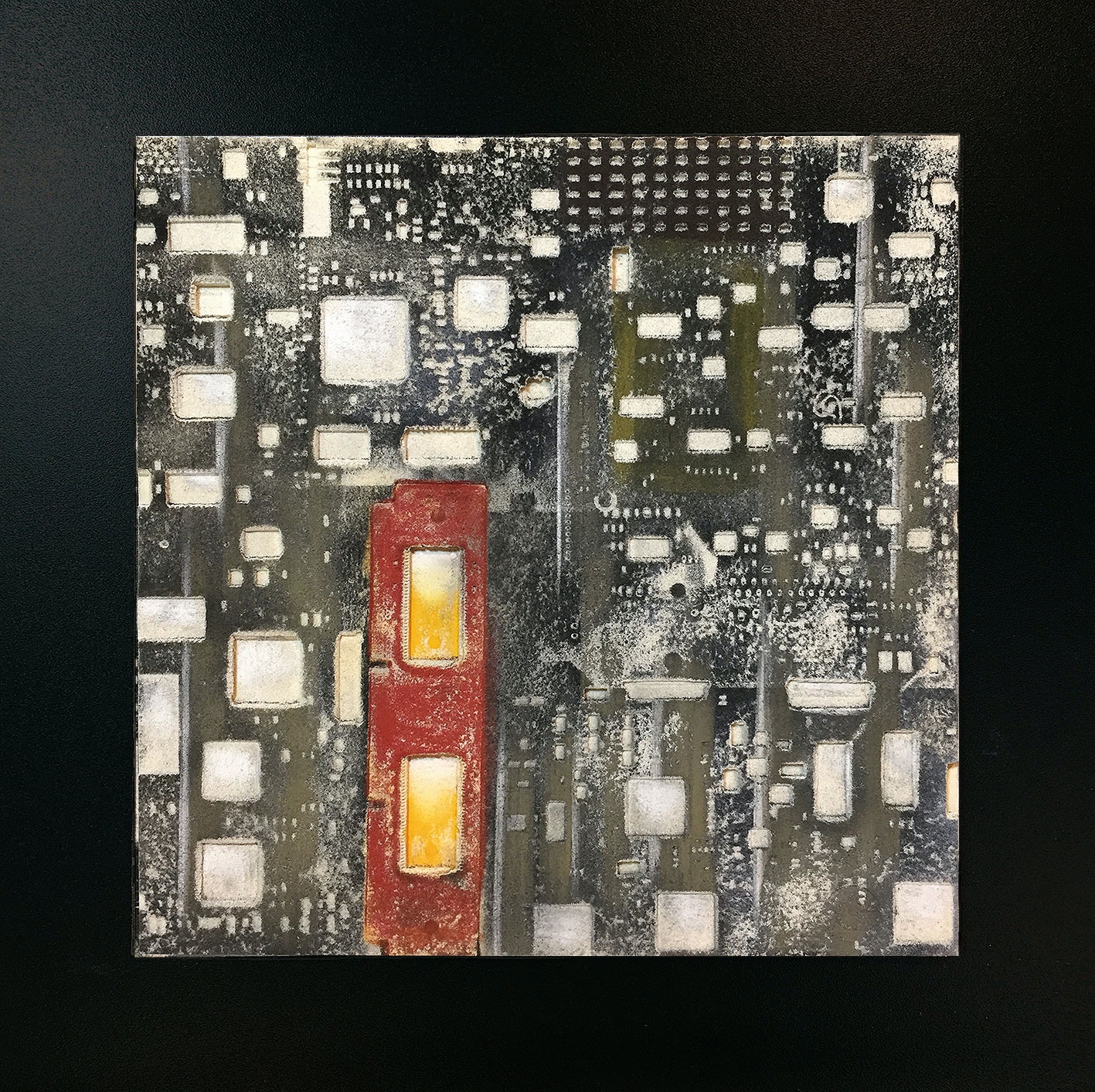 La curiosità per la tecnologia, l’elettronica e la grafica convogliano le forme e i segni, che albergano nella sua mente, verso la sperimentazione plastica con diversi materiali.