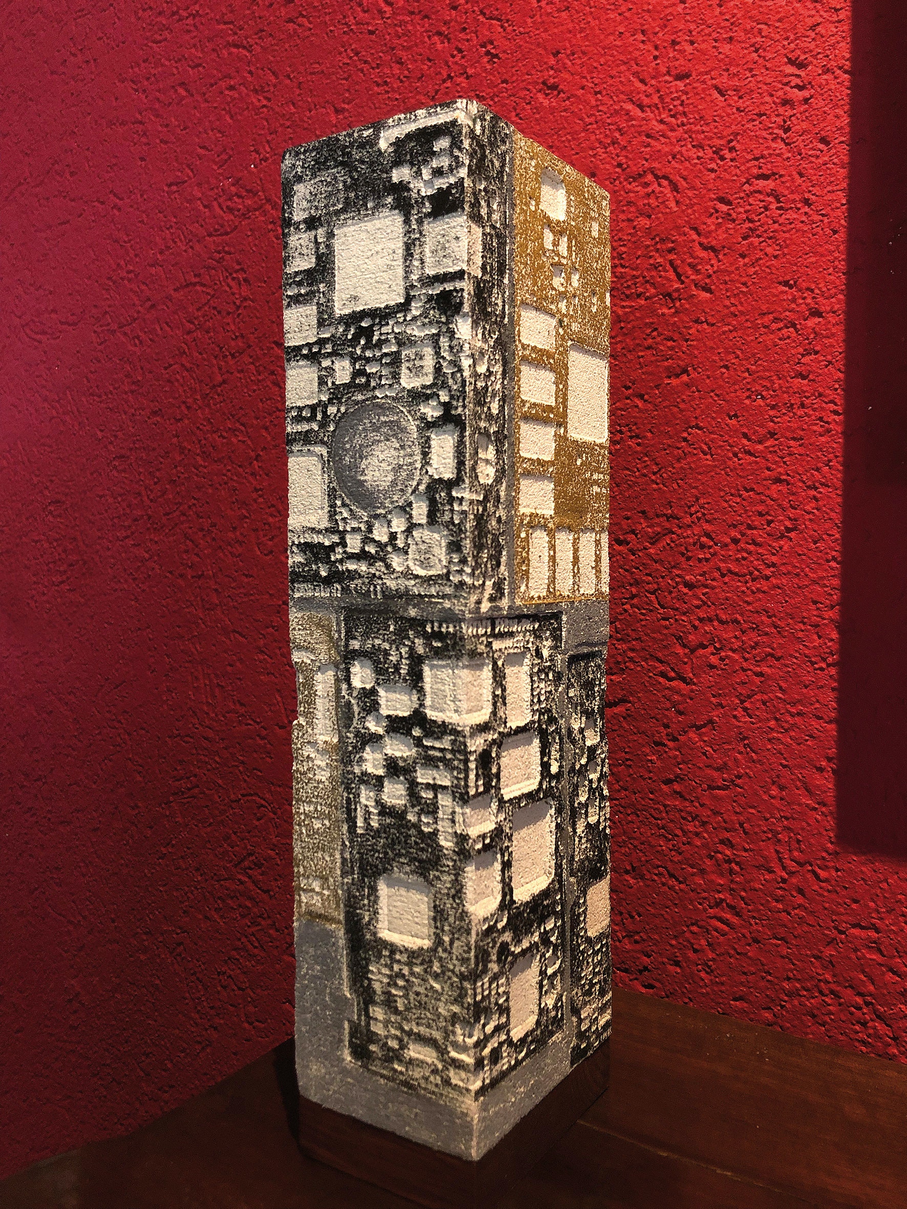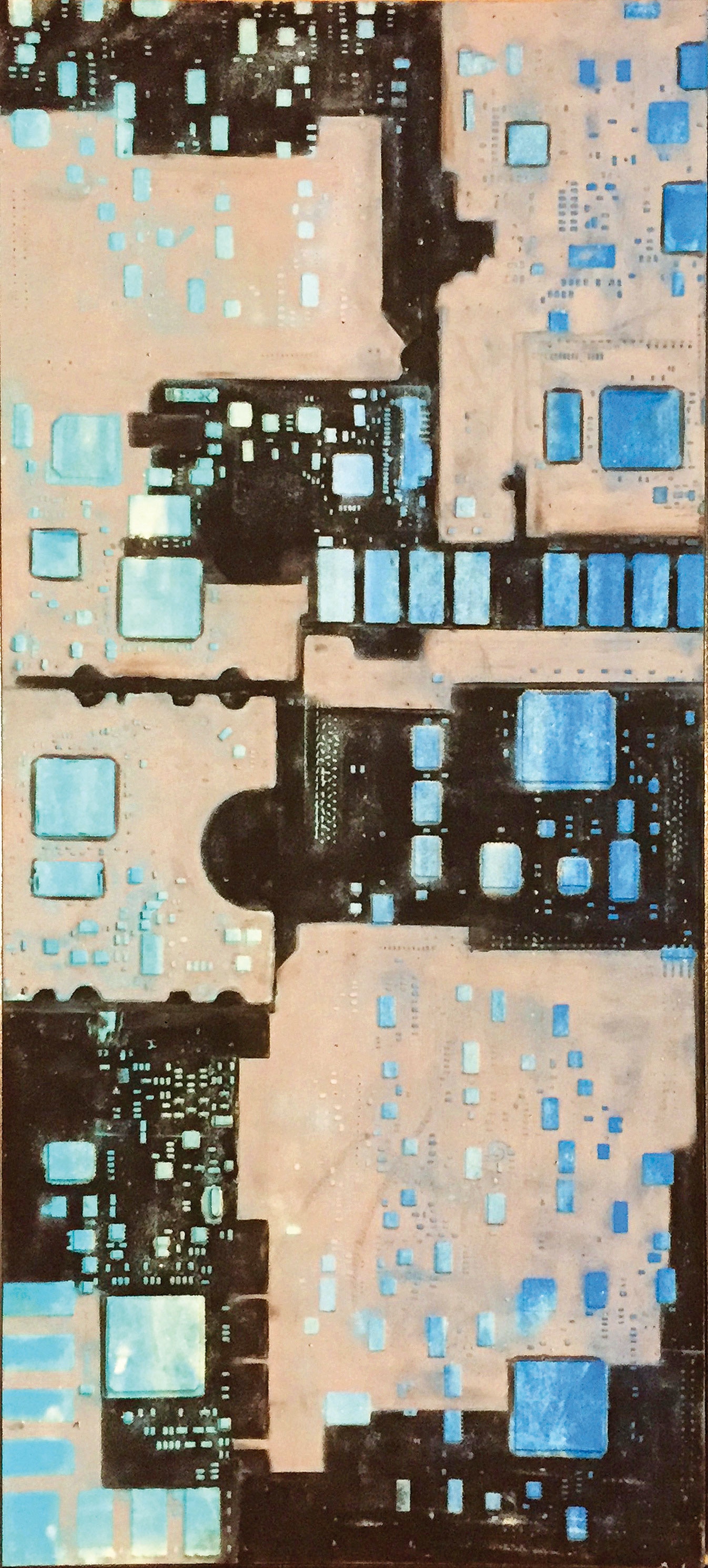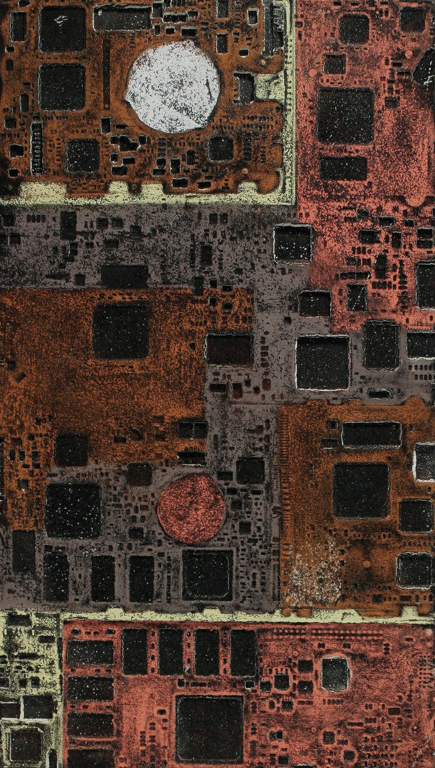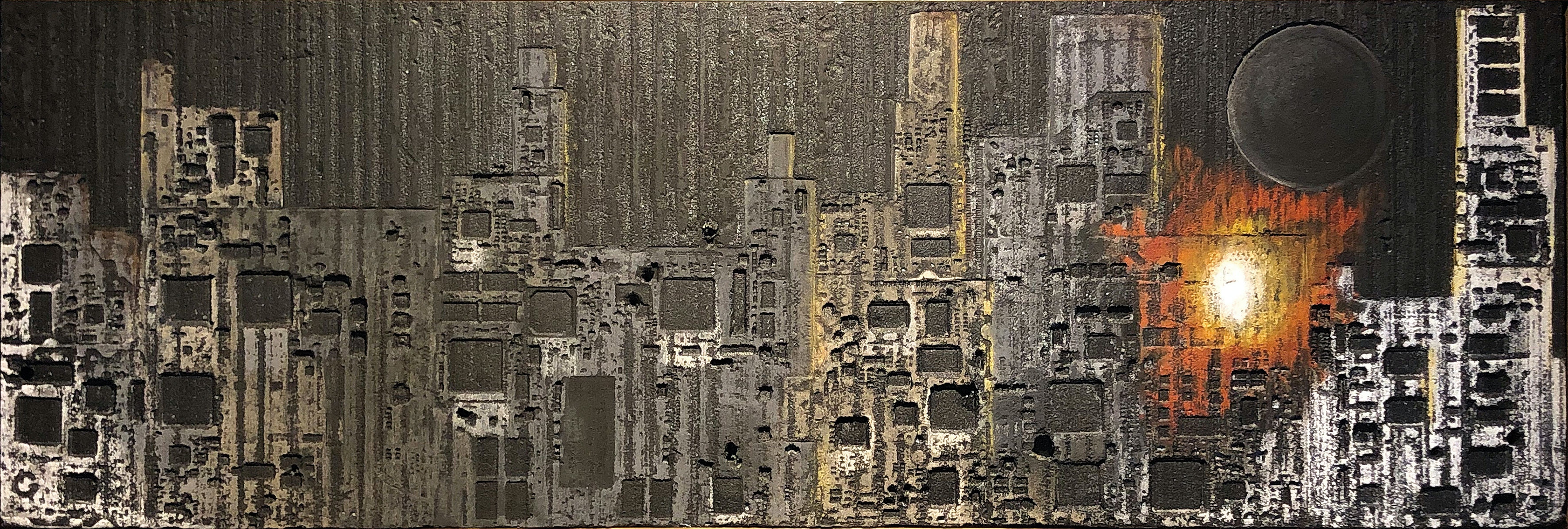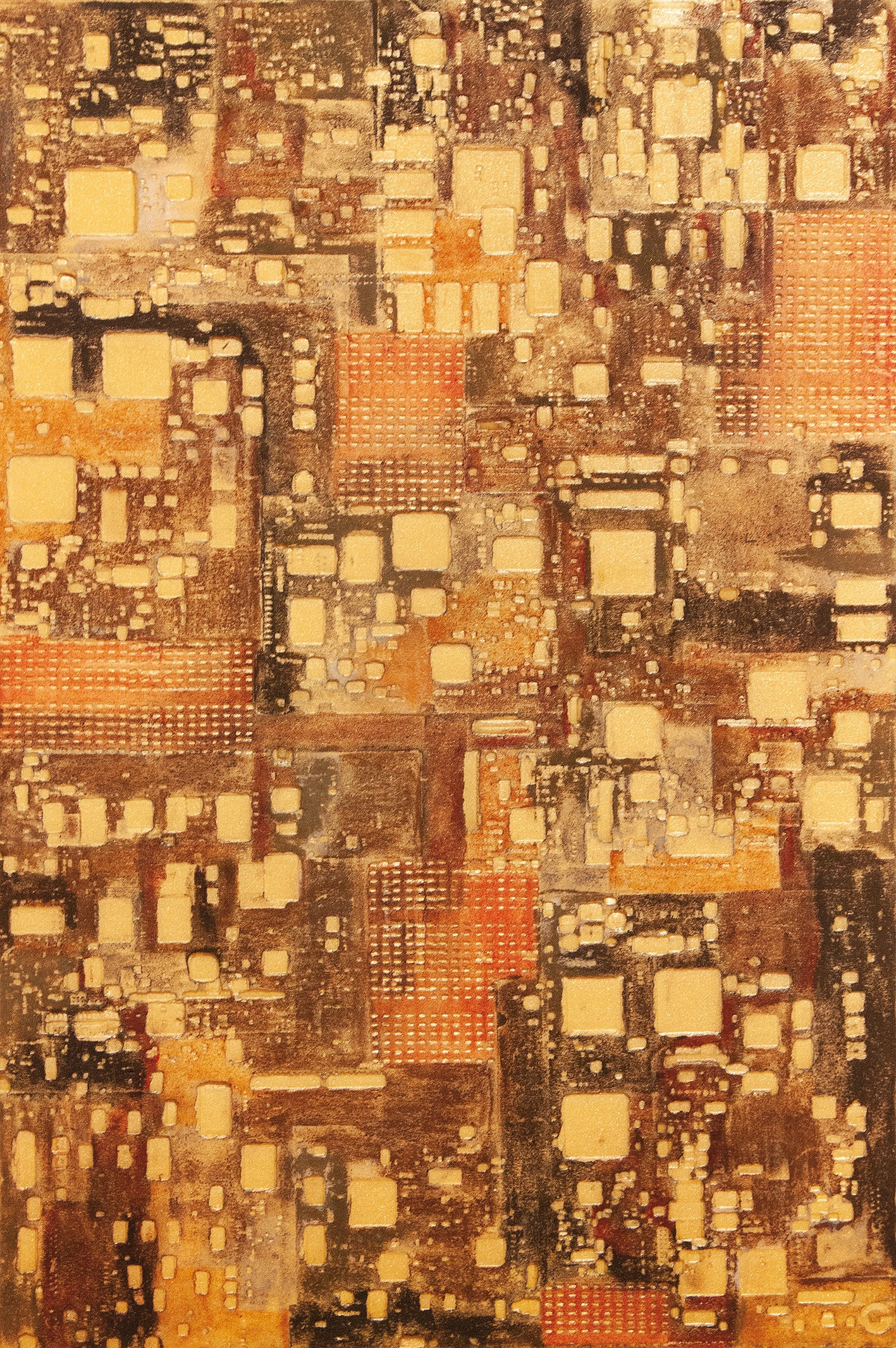 La curiosità per la tecnologia, l’elettronica e la grafica convogliano le forme e i segni, che albergano nella sua mente, verso la sperimentazione plastica con diversi materiali.